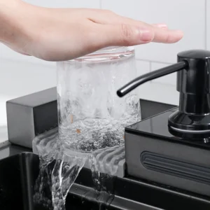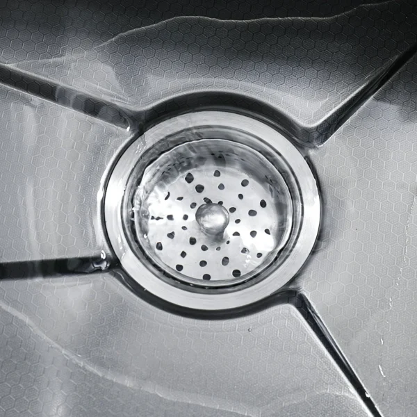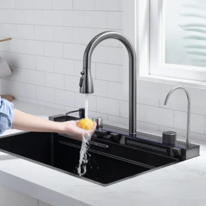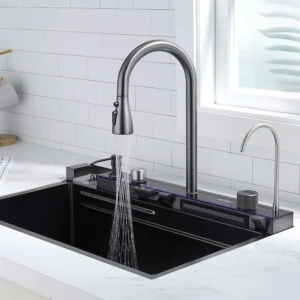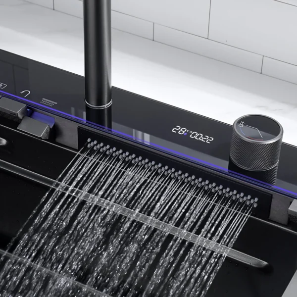 Lux Excite is made of stainless steel and measures 46cmx75cmx25cm. Its honeycomb embossed, nano-coated surface resists water and oil stains, as well as wear and scratches. It features two waterfall faucets with three pull-out water modes, a non-battery digital temperature display, and LED lighting for optimal cleaning. It also includes a water purifier faucet, metal trays, soap dispenser, glass rinser, and wooden cutting board for efficient and easy kitchen work.